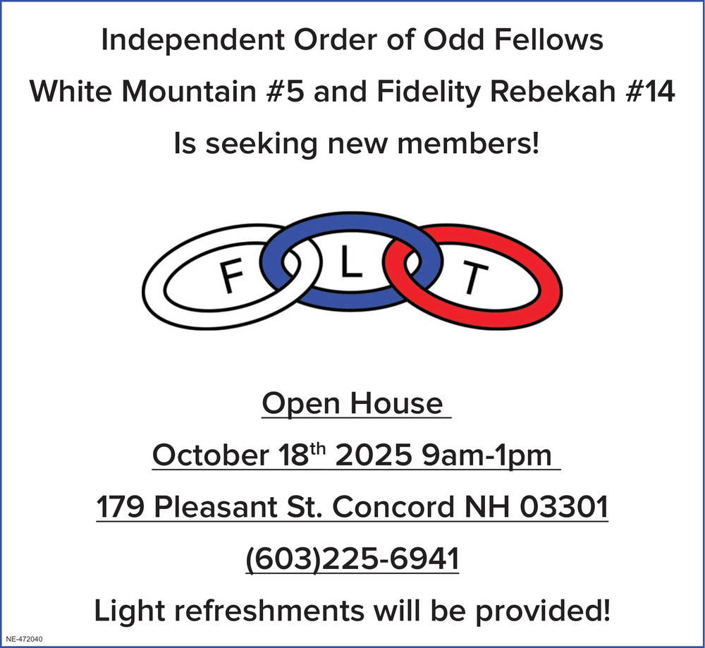 Oct 02, 2025. Independent Order of Odd Fellows Events Ads from Concord Monitor